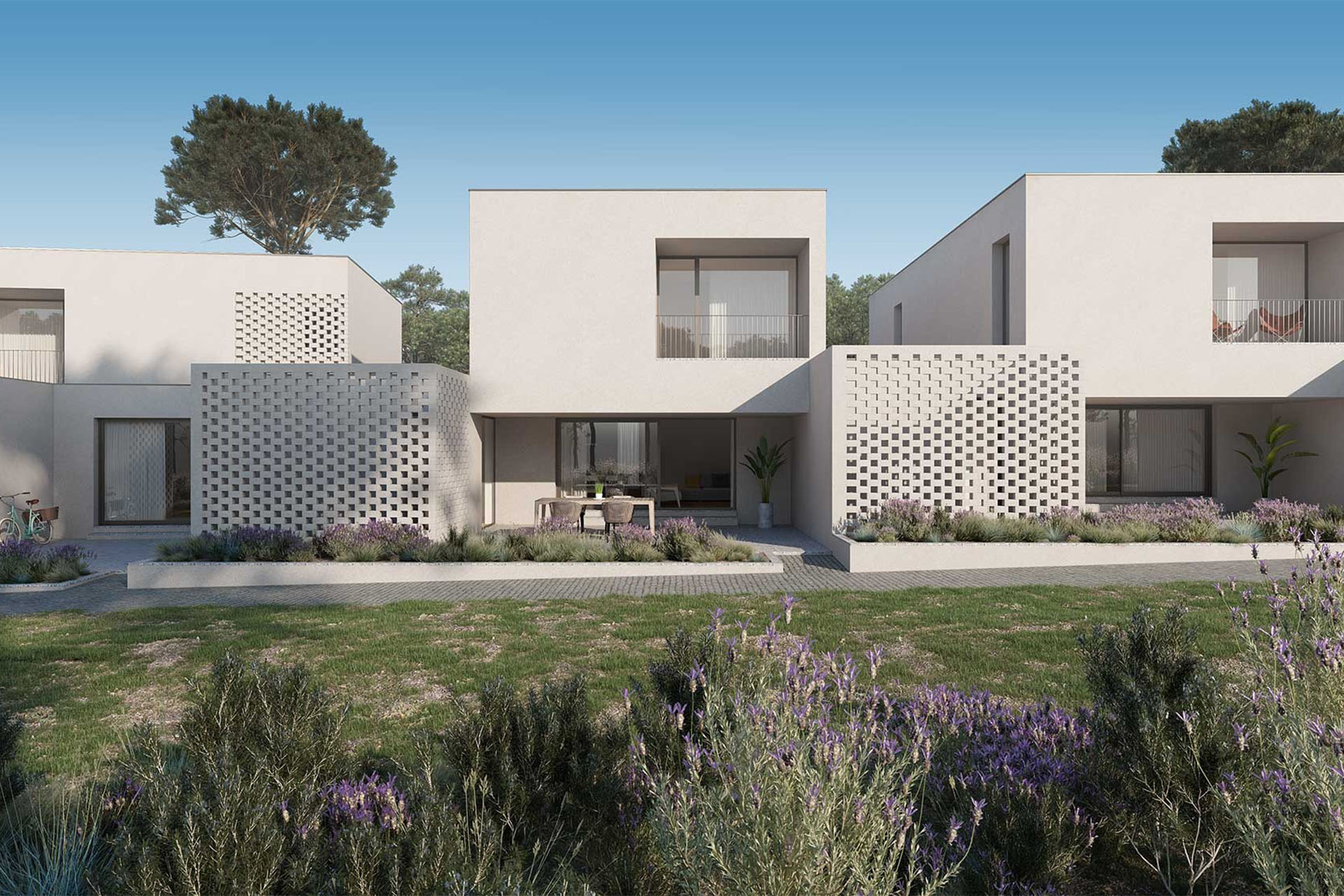 Cada moradia possui áreas que variam entre 162 m² e 199 m², com acabamentos modernos, cozinhas abertas ou integradas e amplos vãos que conectam os interiores a alpendres e terraços exteriores. As propriedades contam ainda com garagens privativas, varandas e espaços exteriores exclusivos, além de um jardim com piscina de uso restrito, oferecendo um ambiente tranquilo e seguro para os residentes. As moradias estão disponíveis a partir de 495.000€ e têm conclusão prevista para abril de 2025.