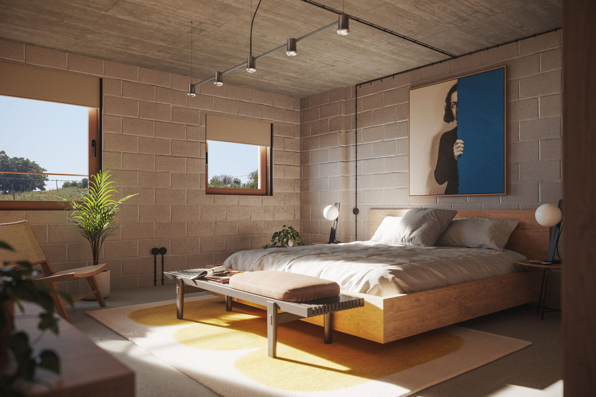 Composto por 12 moradias em banda de tipologias V3 e V4, cada unidade possui áreas que variam entre 162 m² e 199 m², com acabamentos modernos, cozinhas abertas ou integradas e amplos vãos que conectam os interiores a alpendres e terraços exteriores.